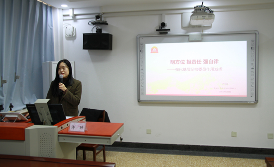 此次培训还邀请东城区委党校管理教研室主任许珅,为大家讲授《明方位 担责任 强自律——强化基层纪检委员作用发挥》。许主任从纪检委员的职能定位、纪检委员的职责要求、纪检委员端正态度锤炼本领等方面,对党史上的纪检监察工作、纪检工作相关职责、主要任务进行介绍,内容翔实,条理清晰。